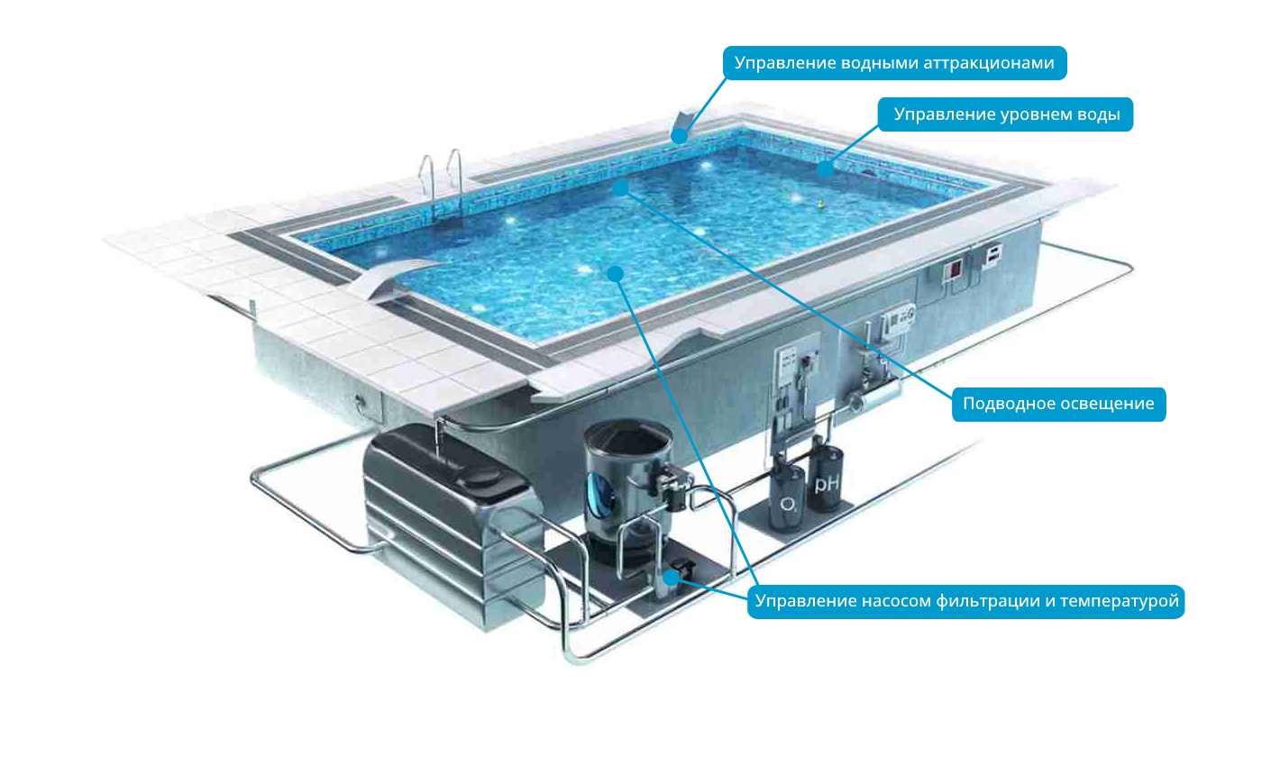 Значительный опыт в областях управления – уровнем воды, фильтрацией и температурой, водными аттракционами, подводным освещением